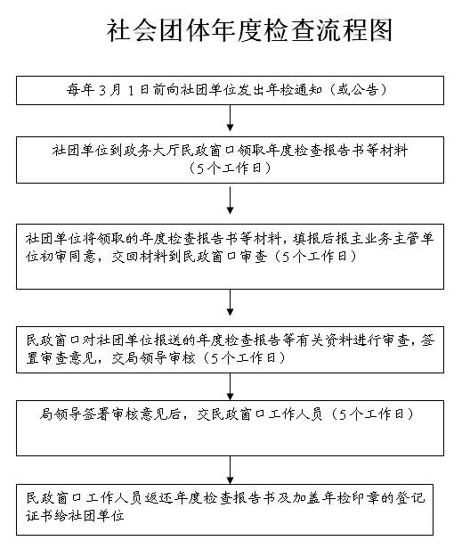 3.社会团体每年5月31日前将经业务主管单位初审的本单位上年度《年度检查报告书》及《年度财务审计报告》、《社会团体年度情况一览表》、《社会团体法人登记证书》(副本)报县政务中心民政窗口;